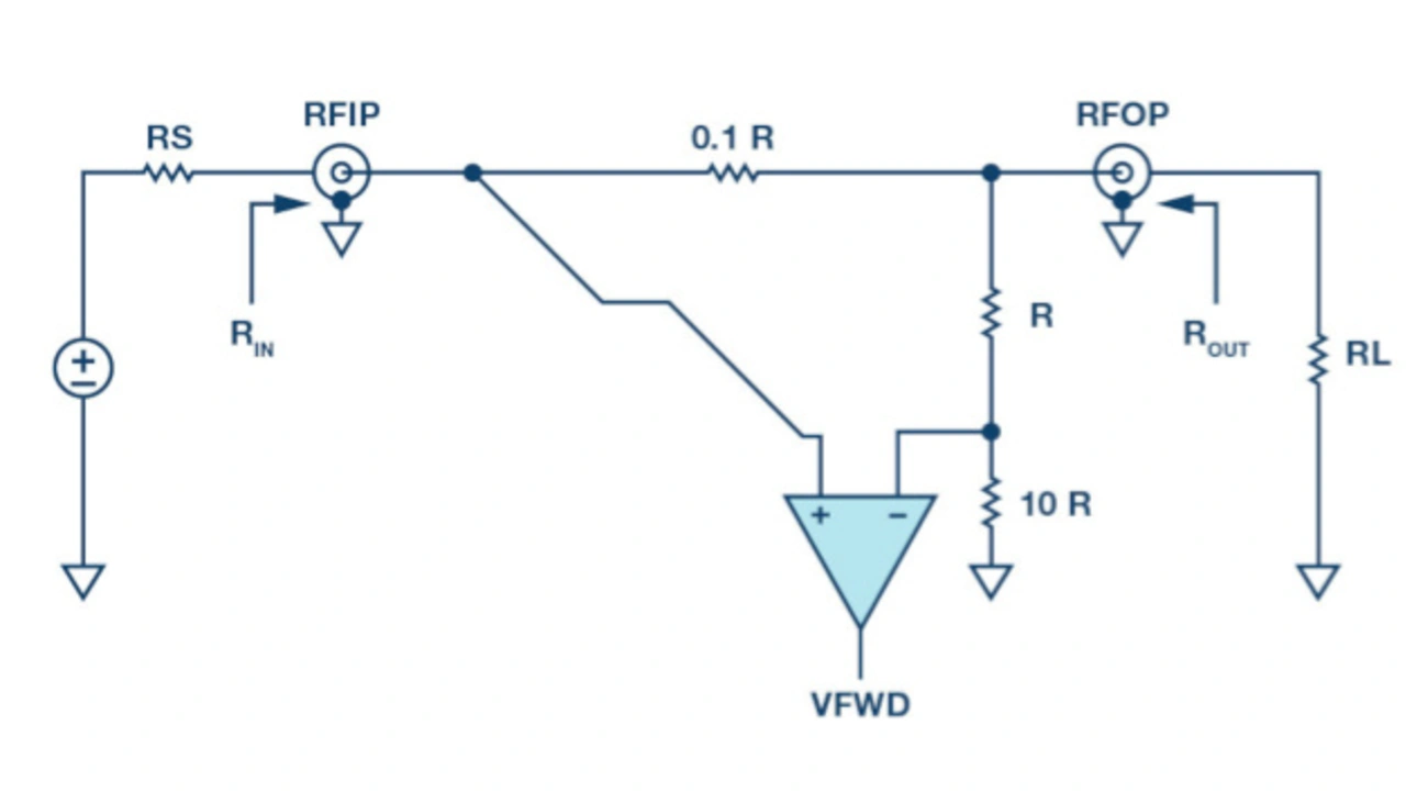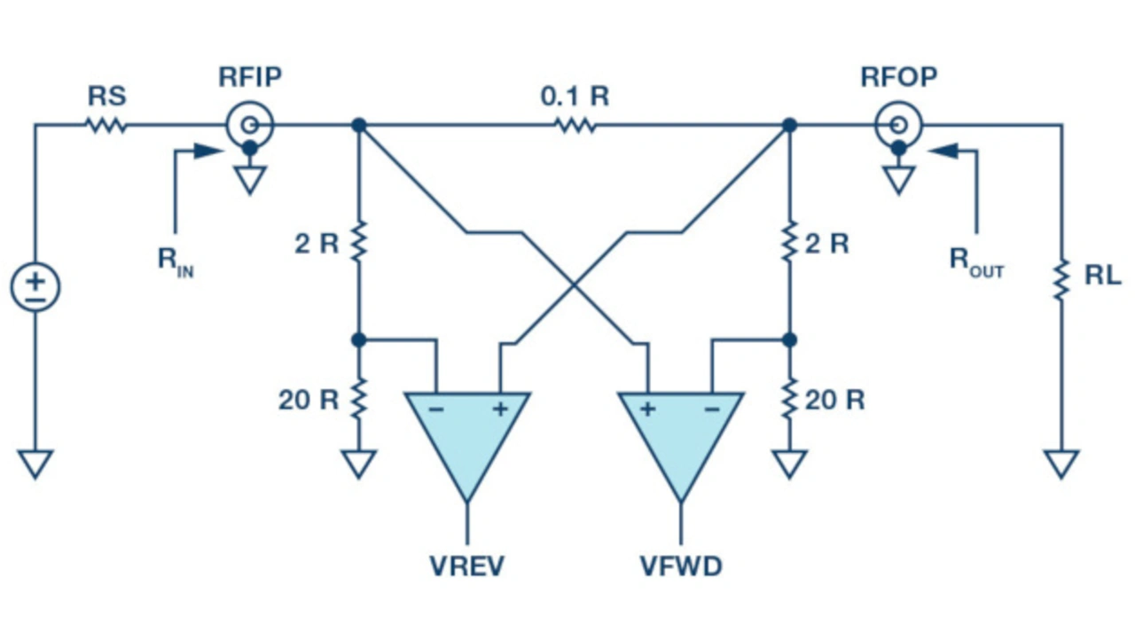 Für die optimale Richtcharakteristik sind Präzisionswiderstände in dieser Topologie wichtig: integrierte Widerstände sind vorzuziehen. Zur Bestimmung der notwendigen Isolierung für die Berechnung der Rückflussdämpfung, wird das Bauteil gewendet (flip) und dann das Eingangssignal an RFOP gelegt. Damit ist die Brücke abgeglichen: die Eingänge des Differenzverstärkers sind abgeglichen, da dieselben Teilerverhältnisse von 0,909 = (10 R) / (10 R + R) = R /( R+0,1 R) eine Differenzspannung von (V+ - V–) = 0 V bewirken.