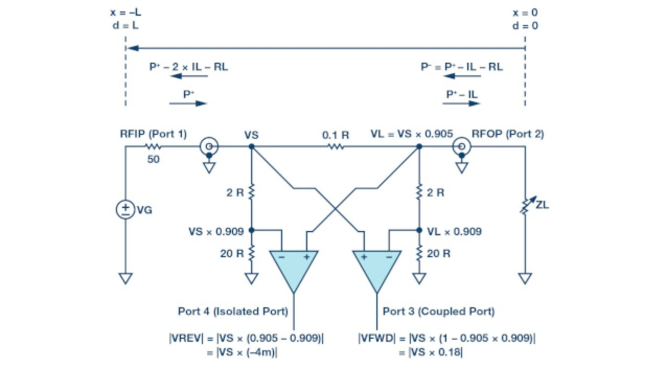 Die Ports liegen wie gezeigt mit dem Eingang (Port 1) bei RFIP, dem Ausgangs (Port 2) bei RFOP, der Kopplung (Port 3) bei VFWD und der Isolation (Port 4) bei VREV. Mit der symmetrischen Struktur liegen die Ports invertiert, wenn ein Signal an ZL reflektiert oder an RFOP angelegt wird. Im Falle einer angepassten Last und einer an Port 1 (RFIP) angelegten Generatorspannung sowie mit ZS = ZL = Z0 = R = 50 Ω, gilt: