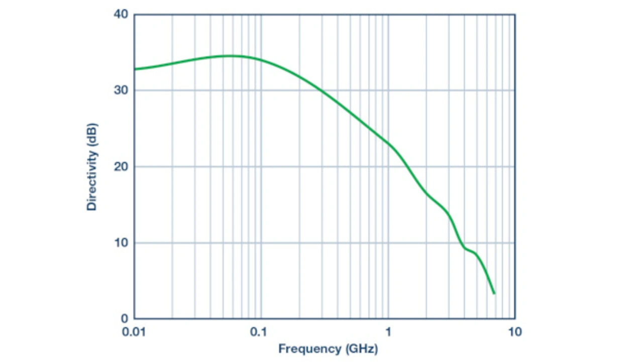 Die Gleichungen in Bild 8 für |VREV| und |VFWD| zeigen die Werte dieser Spannungen bei einem in Vorwärtsrichtung angelegten Signal. Diese Gleichungen belegen für den vereinfachten Schaltplan eine fundamentale Begrenzung der Richtcharakteristik: die Ursache ist die reale Übersprechdämpfung (nur ~ 33 dB Unterdrückung) gegenüber dem isolierten Port.
