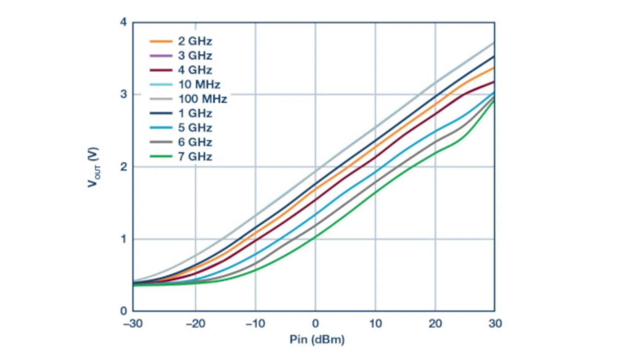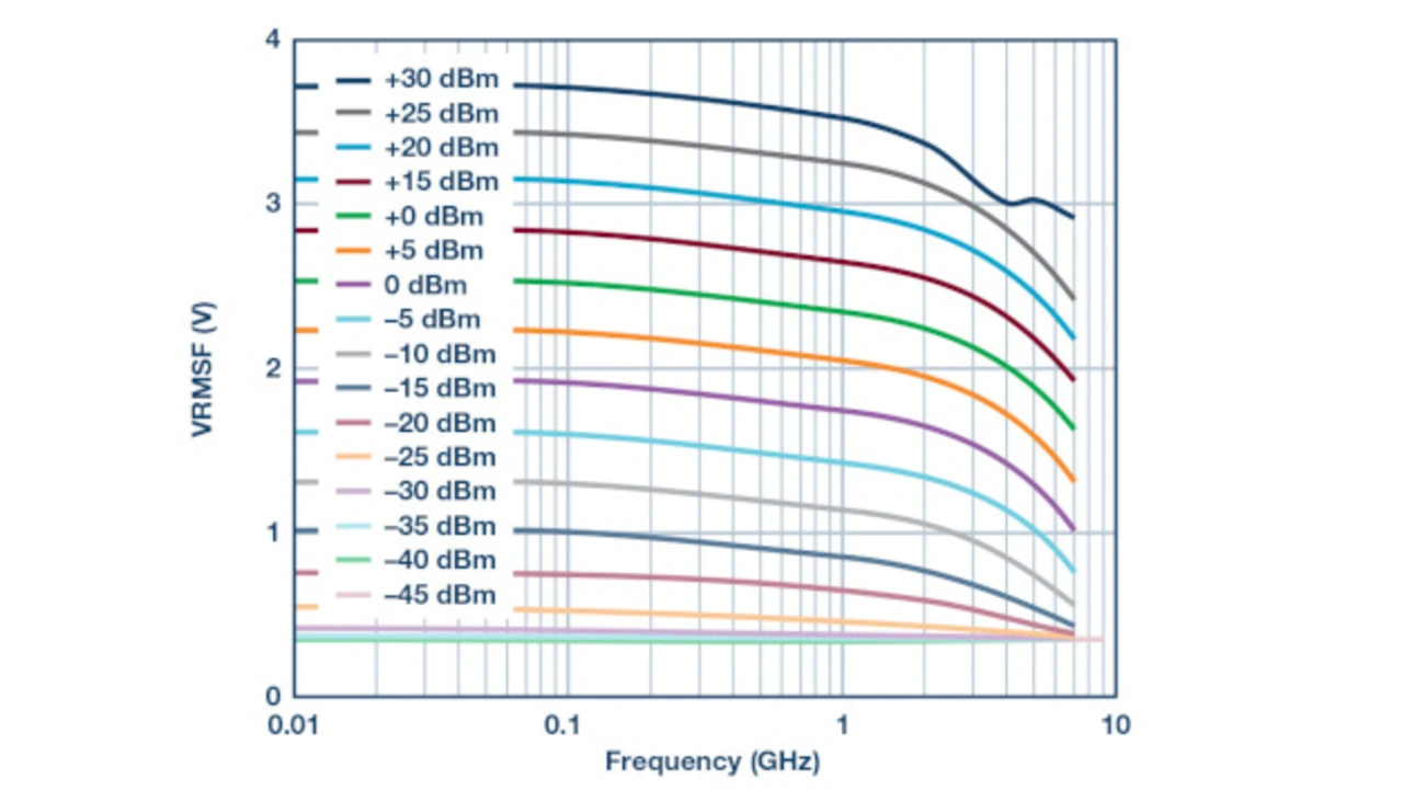 Jede Kurve repräsentiert für einen definierten Leistungspegel die Ausgangsspannung, abhängig von der Frequenz. Während die Darstellung bei 10 MHz endet, wurde der Betrieb bei Frequenzen bis hinunter zu 9 kHz verifiziert. Bild 11 zeigt dieselben Daten als Ausgangsspannung in Abhängigkeit von der Eingangsleistung: jede Kurve zeigt eine andere Frequenz.
