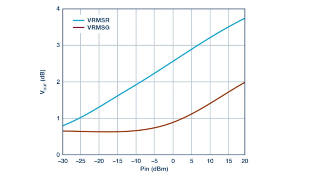 In ADL5920 bilden zwei Linear-in-DBrms-Detektoren von 60 dB Bandbreite die Spannungen VREV und VFWD in jene RMS-Werte VRRMS und VFRMS ab, die (VISO/VSLP) und (VCPL/VSLP) auf der dB-Skala entsprechen.