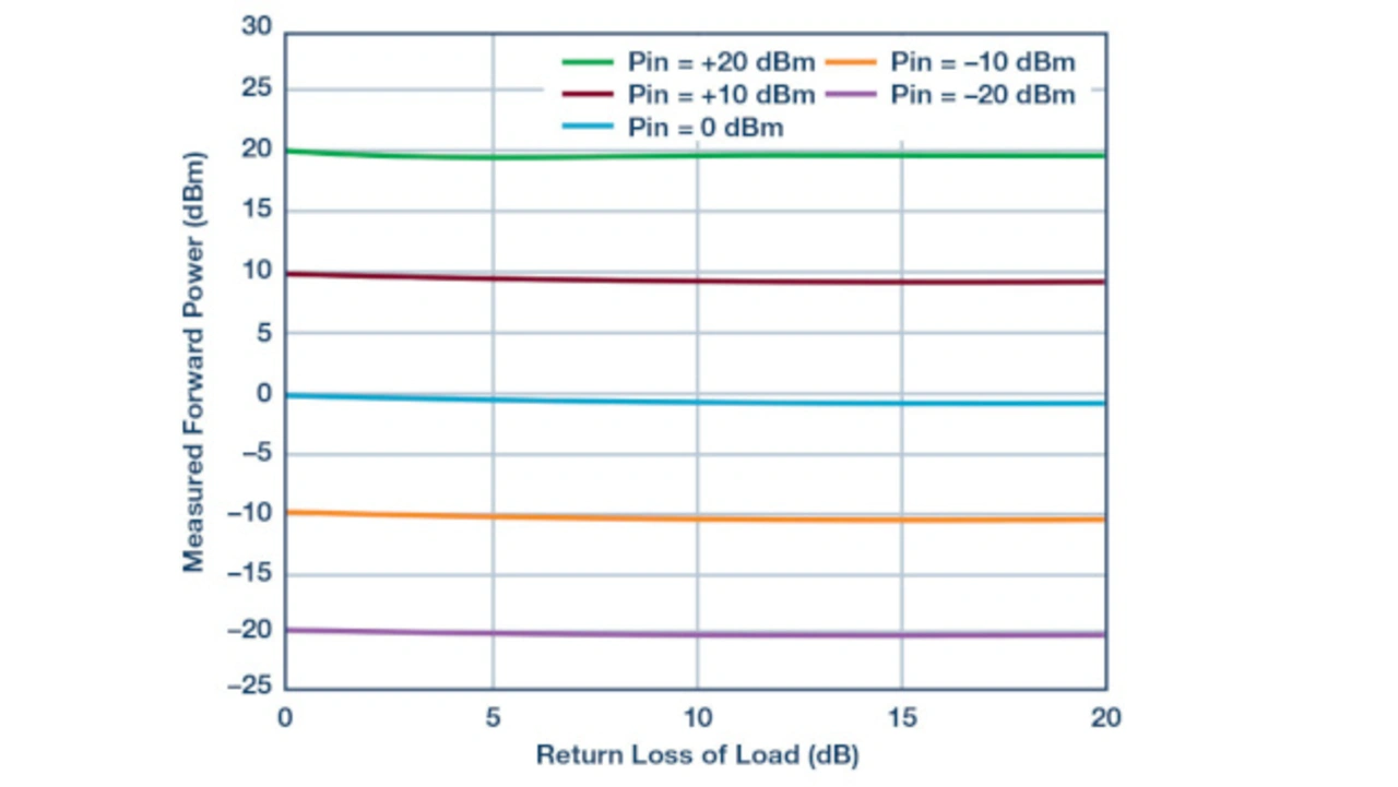 Bild 13 zeigt die Auswirkung auf die Messung der Vorwärtsleistung bei Laständerung. Definierte Leistungspegel werden an den Eingang RFIN angelegt und die Einfügungsdämpfung der Last an RFOUT zwischen 0 dB und 20 dB variiert. Wenn die Einfügungsdämpfung im Bereich zwischen 10 dB und 20 dB liegt, ist die Genauigkeit der Leistungsmessung wie erwartet recht gut. Wird die Einfügedämpfung jedoch unter 10 dB abgesenkt, steigt der Messfehler der Leistungsmessung an. Bei einer Einfügungsdämpfung von 0 dB liegt der Messfehler immer noch im 1-dB-Bereich.