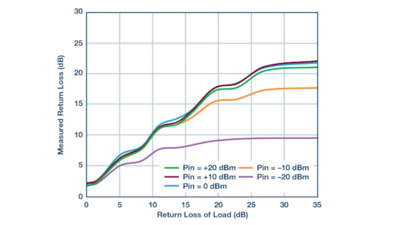 Der Plot birgt einige Informationen: zunächst nimmt die Genauigkeit der Messung mit höherer Rückflussdämpfung ab. Dies liegt an der Richtcharakteristik des Bausteins. Ebenso sinkt die Messgenauigkeit mit fallender Eingangsleistung. Ursache ist der begrenzte Erfassungsbereich und die Empfindlichkeit der integrierten RMS-Detektoren.