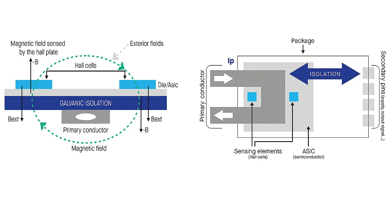 Hall-Effekt-Sensoren haben die Eigenschaft, ein strominduziertes Magnetfeld berührungslos zu messen. Die Hall-Zelle ist ein Sensorelement, das eine Änderung des Magnetfelds in eine Änderung seines Widerstands umwandelt. Wenn ein konstanter Strom durch die Hall-Zelle fließt, gibt sie eine zum Magnetfeld proportionale Spannungsänderung aus.