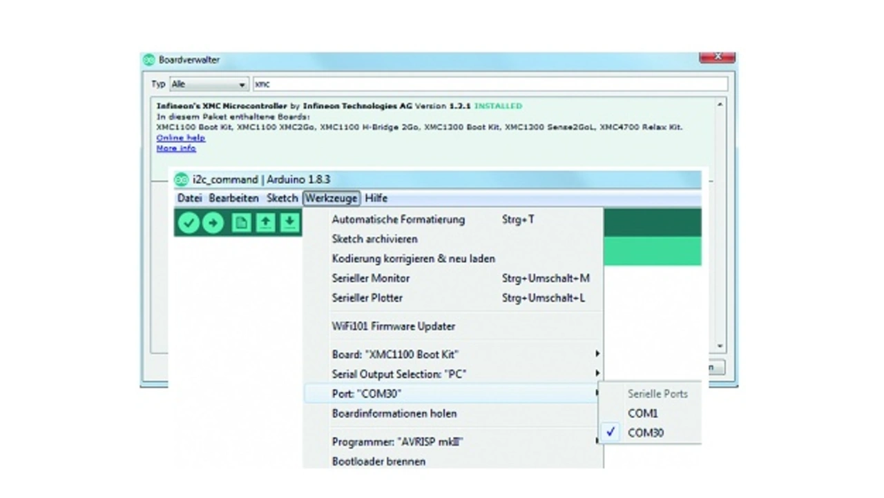Zunächst ist der erforderliche Adapter, der bis zu drei S2Go-Boards aufnehmen kann, auf das µC-Board (Bild 5) zu stecken und das Board per USB mit einem PC zu verbinden. Anschließend wird das µC-Board in der Arduino-IDE (Version 1.8.3) über Werkzeuge – Board – Boardverwalter integriert und der virtuelle COM-Port für USB bestimmt (Bild 6). Dieser grundlegende Vorgang ist unabhängig vom zu verwendenden S2Go-Board stets der gleiche.