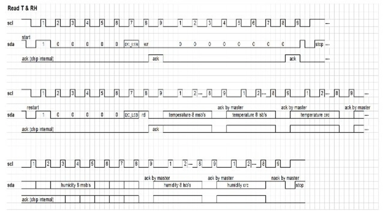 Um z. B. eine kombinierte Temperatur- und RH-Messung (T & RH) durchzuführen, würde der Host das Adressbyte und ein Byte senden, das das Konvertierungsbefehlsbit und Bits enthält, die die gewünschte Auflösung für die Temperatur- und RH-Messungen angeben. Das Gerät unterstützt ein einfaches Polling-Verfahren, d. h. nach dem Senden der Zwei-Byte-Konvertierungsbefehlssequenz würde der Host-Prozessor die im Datenblatt angegebene auflösungsabhängige Dauer abwarten, bevor er eine Zwei-Byte-Sequenz mit dem Adressbyte (0x40 oder 0x41), gefolgt vom T&RH-Lesebefehlsbyte (0x0), ausgibt (Abbildung 2, obere Zeile). Der HTU31D würde antworten, indem er die höherwertigen und niederwertigen Bytes der Rohwerte für jede angeforderte Temperatur- und Feuchtemessung überträgt (Abbildung 2, untere zwei Zeilen). Die Rohwerte werden mit Hilfe eines Gleichungspaares, das im Datenblatt des HTU31D enthalten ist, in die entsprechenden physikalischen Temperatur- und Feuchtewerte umgerechnet.