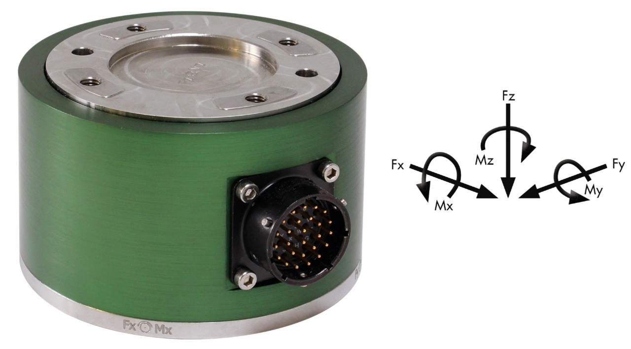 ...mit einem Durchmesser von 95 mm bei 60 mm Höhe misst bis zu drei Kräfte und Drehmomente Fx/Fy/Fz und Mx/My/Mz gleichzeitig. Dabei werden die einzelnen Werte nicht wie oft üblich extrapoliert, sondern jede Messgröße wird über einen eigenen Dehnmessstreifen erfasst. Die jeweiligen Werte können über handelsübliche Messverstärker – im Bereich 20-100 Prozent mit einer Linearitätsabweichung von 0,1 Prozent vom Endwert – ausgelesen werden. Auch hierfür bietet Burster verschiedene Produkte.