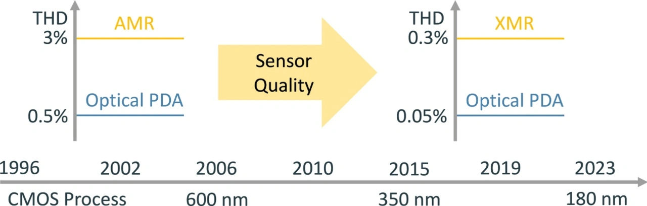 Für gute Messergebnisse ist eine qualitativ hochwertige Vorverstärkung nötig, die den Wandler möglichst voll aussteuert. Das analoge Frontend (AFE) muss dabei differentielle Signale von 30 mV (AMR-Sensor) bis 3 V (TMR, für optische Sensoren bis 500 mV) rauscharm und driftfrei aufbereiten. Passend zur gestiegenen Qualität der Sensoren (Bild 1) sind analoge Signalkorrekturen im Sub-%-Bereich gewünscht, will man keine KI mit digitalen Korrekturrechnungen beschäftigen. Eine diskrete analoge Signalaufbereitung birgt aber Designrisiken, benötigt Platz und verursacht hohe Kosten – hierfür bietet der vollintegrierte iC-NQE von iC-Haus einen Ausweg.