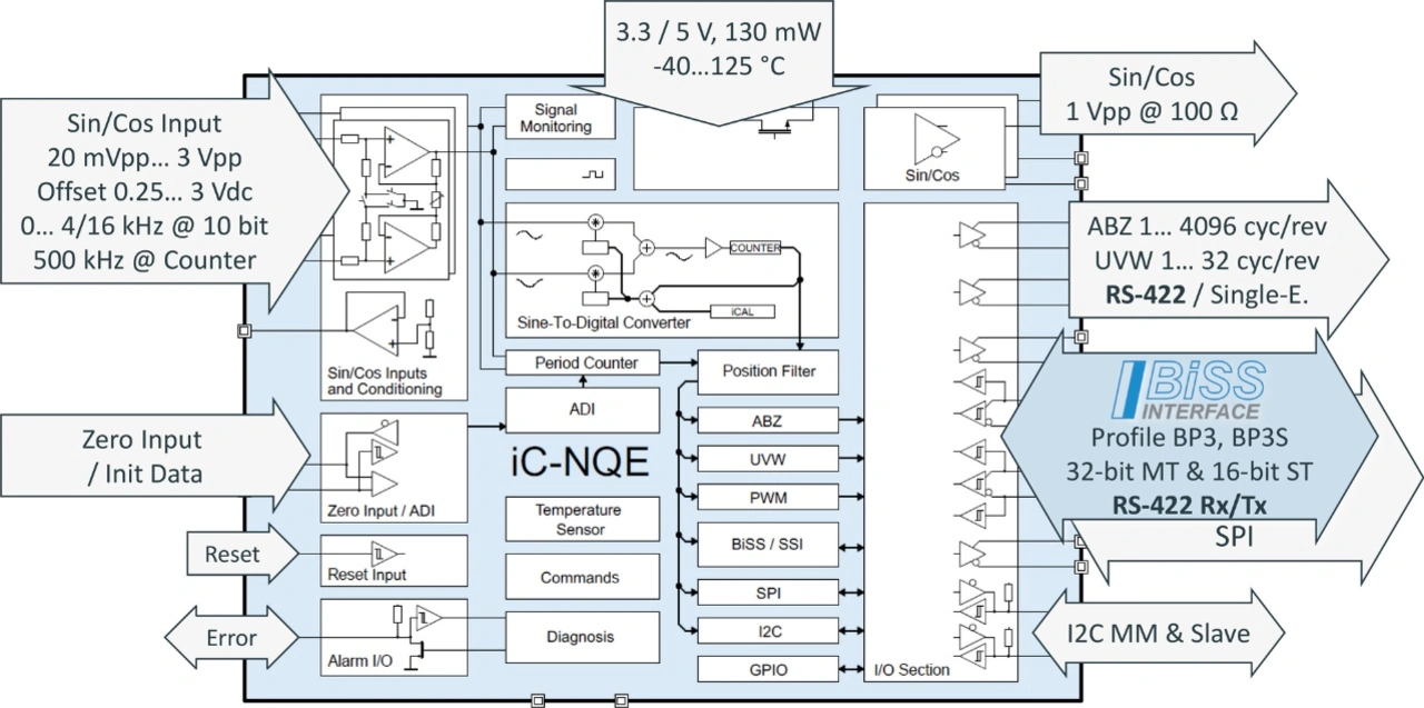 Die Positionswertausgabe erfolgt vorzugsweise über das BiSS Interface, passend zu bereits definierten Profilen, wahlweise inklusive Lebenszeichenzähler und langem 16-Bit-CRC. Ein Alleinstellungsmerkmal des iC-NQE ist die gleichzeitige Ausgabe stabilisierter Sin/Cos-Signale über eine kabeltaugliche 1-Vss-Schnittstelle für Kontrollzwecke oder zur Anbindung der Steuerung.