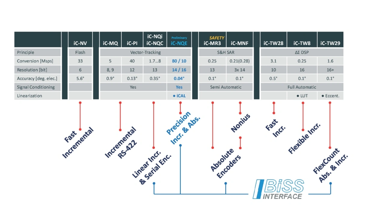 Schnelle Flash-Wandler mit parallel arbeitenden Komparatoren (iC-NV) bedienen beispielsweise Ultraschall-Sensoren und optische Inkrementalgeber, Sample-&-Hold-SAR-Wandler eignen sich für höherfrequente Signale optischer Absolutwertgeber (z.B. iC-MR3), und digitale Signalprozessoren vereinfachen vorrangig die Kommissionierung magnetischer Geber auf Knopfdruck (z.B. iC-TW8). Bausteine mit serieller BiSS-Schnittstelle unterstützen Antriebsregler durch kurze Zykluszeiten.