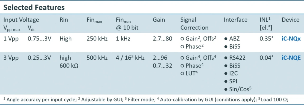 Dank moderner CMOS-Technologie bietet der High-Performance-Mixed-Signal-Baustein iC-NQE beachtenswerte Verbesserungen an: eine achtfach höhere Genauigkeit und Auflösungen bis 16 Bit oder eine mindestens vierfach höhere Geschwindigkeit für industrieübliche Linearsysteme (Tabelle 2).