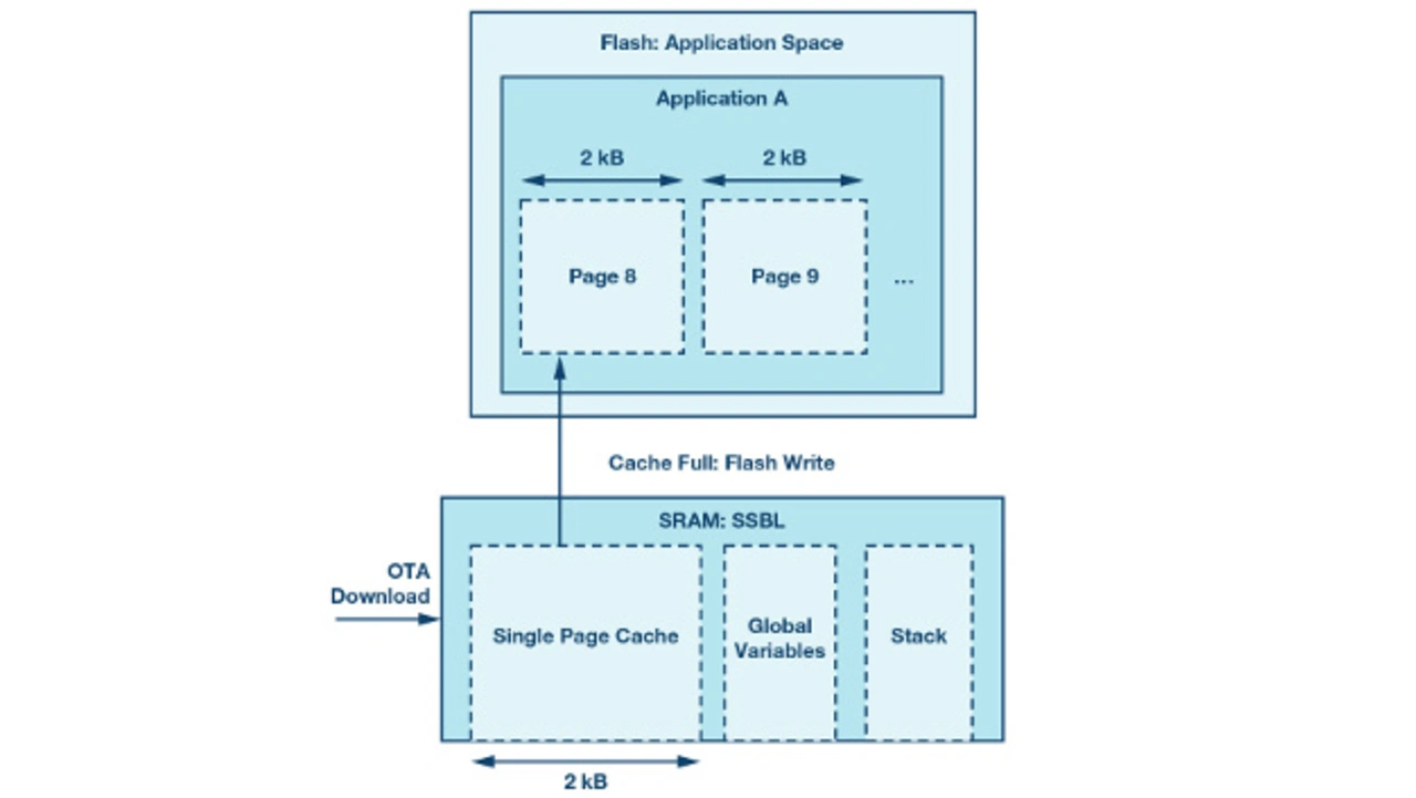 Eine weitere wichtige Entscheidung bei der Entwicklung der OTA-Update-Software betrifft die Organisation der eintreffenden Applikationen im Speicher beim OTA-Update-Prozess. Mikrocontroller enthalten normalerweise nichtflüchtigen und flüchtigen Speicher (Flash-Memory oder SRAM). Im Flash-Speicher befinden sich der Programmcode und Nur-Lese-Daten (Read Only) einer Applikation, zusammen mit anderen System-Level-Daten wie das Inhaltsverzeichnis und ein Ereignisprotokoll.