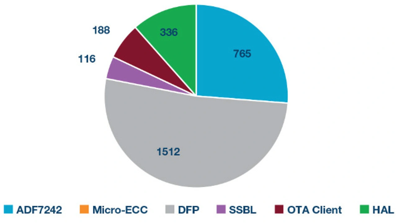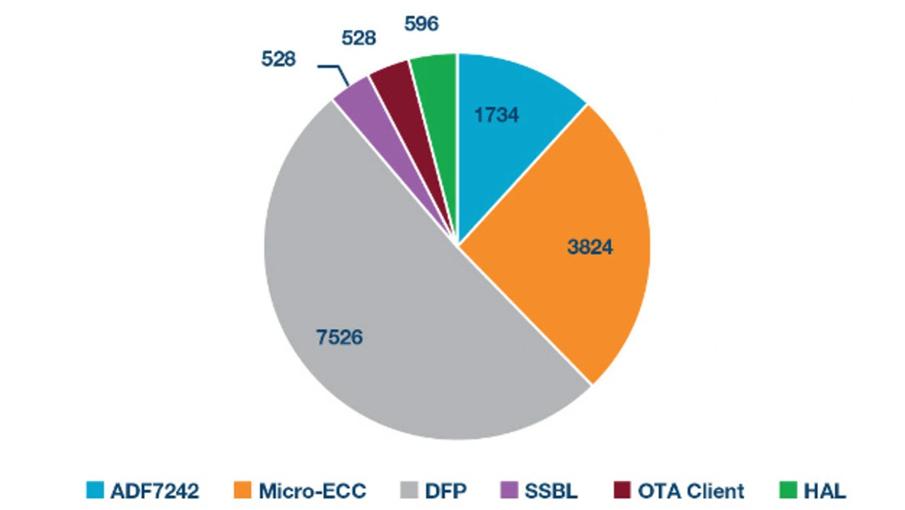 Die Applikationssoftware für den OTA-Update-Prozess benötigt nur etwa 1,5 kB, wobei der Rest für Bibliotheken, beispielsweise DFP, Micro-ECC und ADF7242-Stack, verwendet wird. Die Ergebnisse helfen, den Entwicklungskompromiss bezüglich der Rolle, die der SSBL im System spielen sollte, zu veranschaulichen. Der größte Teil des Speicherbedarfs von 15 kB stellt der Update-Prozess. Der SSBL selbst beansprucht nur etwa 500 Byte mit zusätzlich 1 bis 2 kB DFP-Code für den Gerätezugriff, wie der Flash-Treiber.