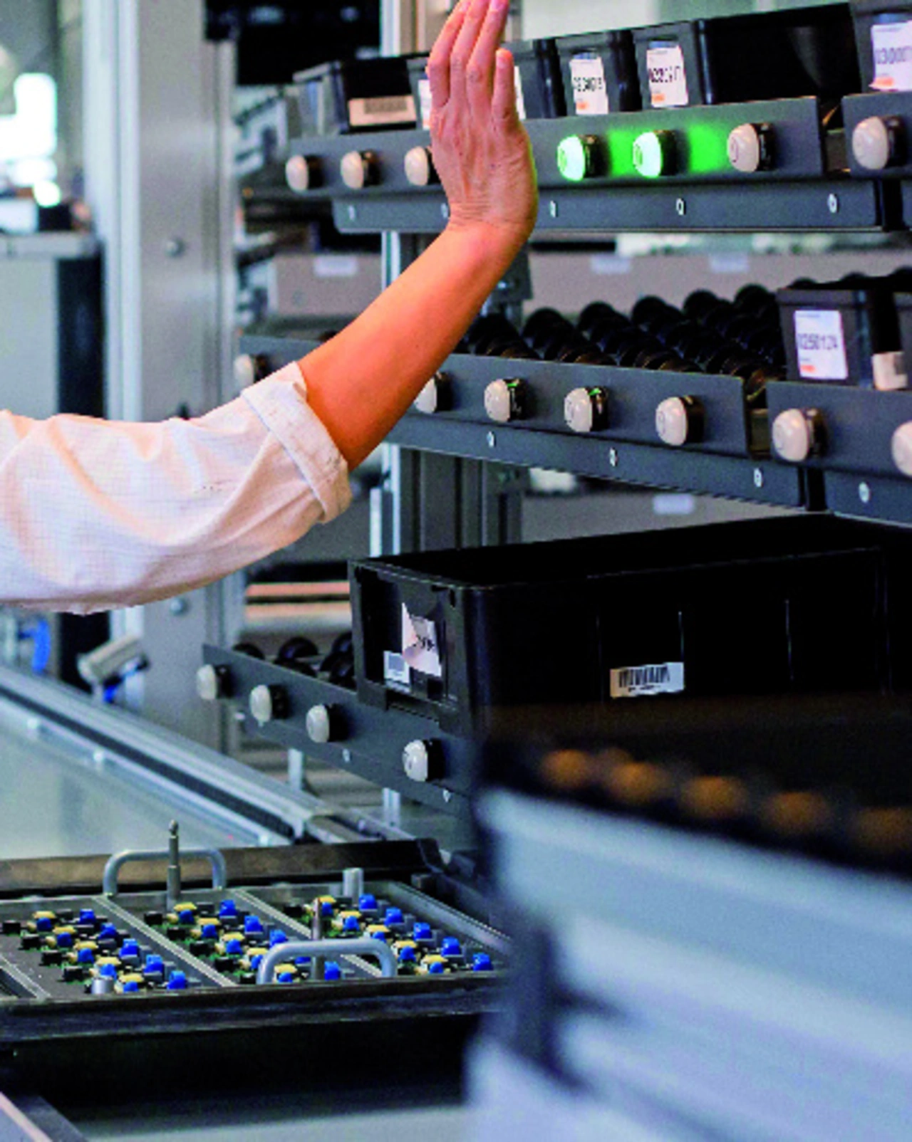 Resultat war ein System, das die für die spezielle Anwendung optimalen Einzelkomponenten mit einer speziell für die THT-Applikation in Halver entwickelten Software kombiniert. Die Software steuert nicht nur den Prozess, sondern kann auch die Produktivität der THT-Bestückung erfassen und über einen separaten Monitor visualisieren. Über die erfassten Daten lassen sich bei einer späteren Analyse gegebenenfalls weitere Ansatzpunkte für Optimierungen identifizieren. Hardware-seitig kommen an den neuen Bestückungsplätzen unter anderem zwei HMI/PLC-Systeme zum Einsatz, eine BL67-I/O-Station sowie diverse Sensoren und Leuchttaster samt Anschlussleitungen. Heute stehen die Anwender vor zwei ergonomisch gestalteten Pick-to-Light-Regalsystemen, die mit bis zu 48 Fächern für zu verbauende Komponenten versehen werden können.