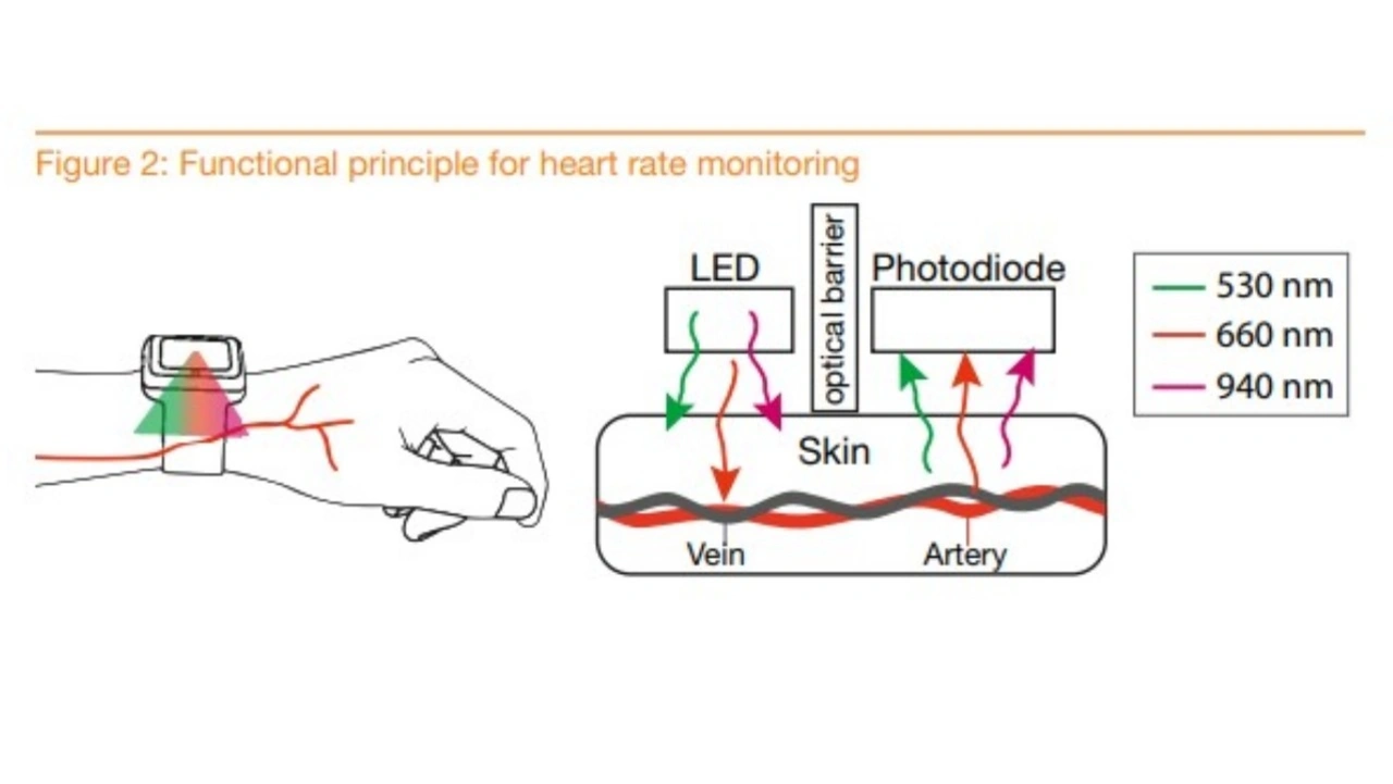 LEDs nutzen die verschiedenen Wellenlängen von Licht für eine genaue Pulsmessung. Um eine Herzfrequenz zu erfassen, wird zunächst von der LED des Sensors grünes Licht in die Haut emittiert, wo es zum Teil an den Blutgefäßen gestreut wird und teilweise vom Blut absorbiert wird. Der reflektierte Teil des Lichts wird mit einer Photodiode im Sensor detektiert und mit komplexen integrierten Schaltkreisen weiterverarbeitet. Da sich das Blutvolumen mit der Herzfrequenz ändert, wird die Absorption des Lichts und das Signal der Photodiode entsprechend von der Herzfrequenz moduliert. Dieses Prinzip wird Photoplethysmographie, oder kurz PPG genannt. Durch die Messung des PPG-Signales für rotes und infrarotes Licht kann der Sauerstoffgehalt des Blutes gemessen werden.