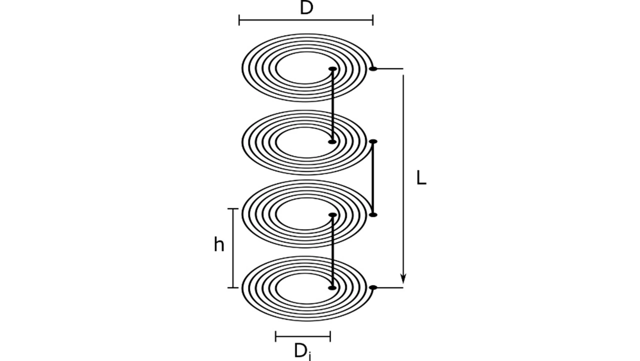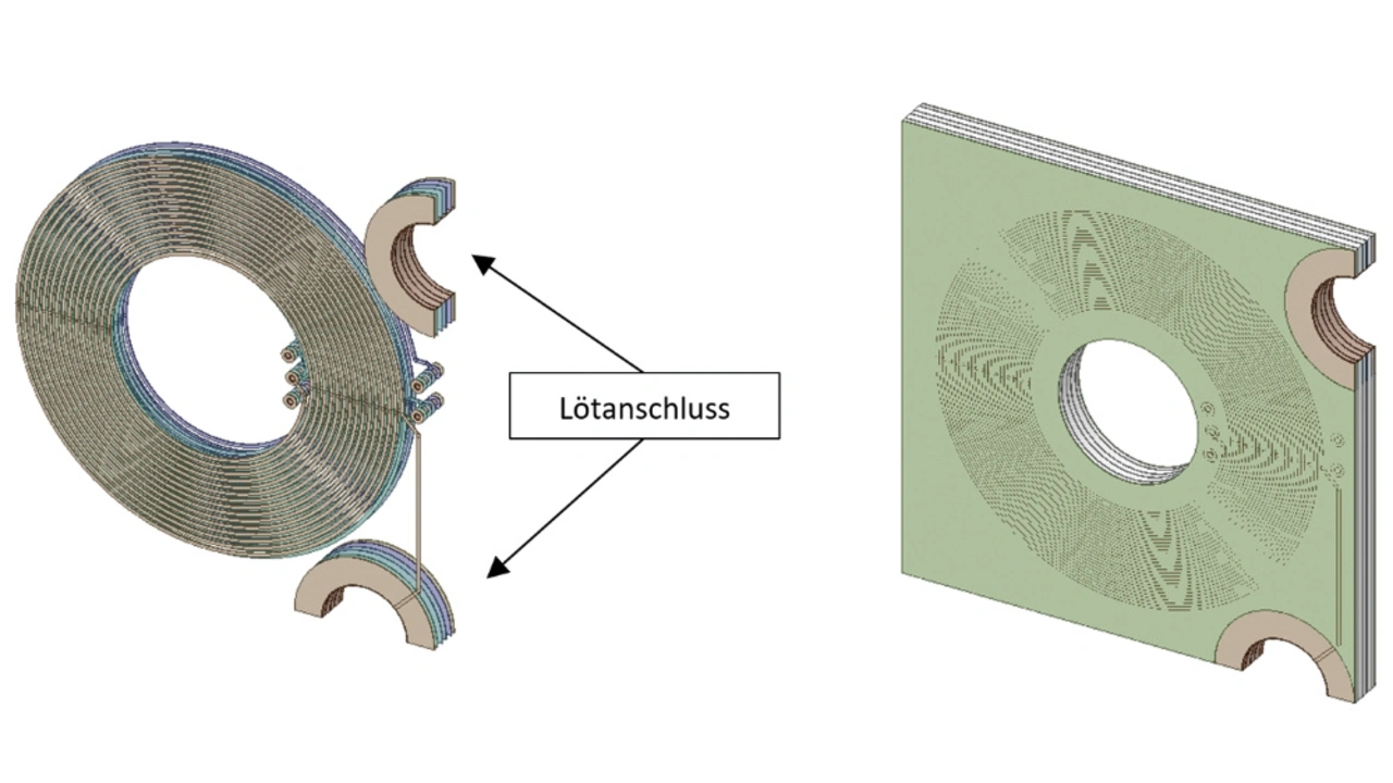 Umgesetzt werden soll das Konzept mit standardisierten Planarspulen. Planarspulen werden im Vergleich zu Standardspulen zunächst in radialer Richtung aufgebaut und dann durch axiale Anordnung in die dritte Dimension erweitert (Bild 3). Die fertigungstechnische Umsetzung erfolgt in einer mehrlagigen Leiterplattenausführung (Bild 4). In dem hier vorliegenden Konzept wurden Planarspulen mit einem Innendurchmesser von Di= 12 mm und einem Außendurchmesser von Da= 20 mm umgesetzt und innerhalb einer sechslagigen Leiterplatte verwendet. Die elektrische Kontaktierung dieser sechs in Serie geschalteten Planarspulen erfolgt über die im Leiterplattenrandbereich angeordneten Durchkontaktierungen, die durch Fräsung der Leiterplattenaußenkante radial für die Lötmontage zugänglich gemacht werden.