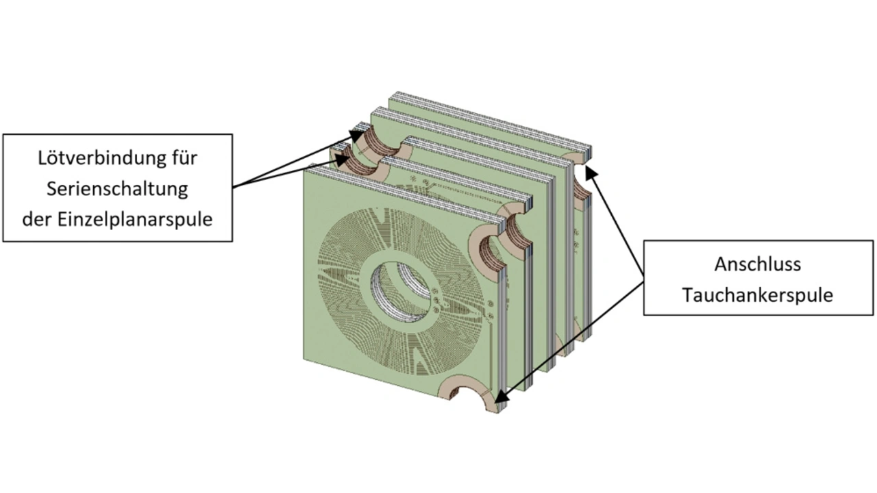 Die Umsetzung zur Tauchankerspule erfolgte durch axiale Anordnung dieser Leiterplatten bei gleichzeitiger Serienverschaltung durch das Setzen entsprechender Lötverbindungen bei den Durchkontaktierungen im Leiterplattenrandbereich. Eine Explosionsdarstellung der so realisierten Tauchankerspule ist in Bild 5 dargestellt.