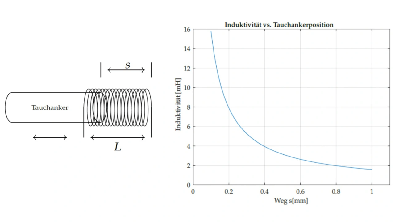 Würde eine einfache Standardspule, wie in Bild 6 dargestellt, verwendet werden und ein Target aus magnetisch leitfähigem Material in den Spuleninnenbereich stirnseitig eindringen, so würde sich die Induktivität über die Eindringtiefe s nichtlinear verändern. In dem vorliegenden neuen Ansatz wird dieser Effekt dadurch verhindert, dass der Abstand der einzelnen Planarspulen aufgrund des Leiterplattenlagenaufbaus fertigungsbeding sehr klein gewählt ist, und sich damit die Induktivität bei vorhandenem Target stetig ändert. Diese Änderungen überlagern sich somit additiv über die Eindringtiefe des Targets, was zu einem quasilinearen Anstieg der Induktivität führt. Die Sättigung der Induktivität tritt ein, wenn der Tauchanker den Spuleninnenraum komplett durchsetzt. Dieser lineare Verlauf ist bei Wegsensoren wesentlich, da dadurch eine über den gesamten Wegbereich konstante Sensorempfindlichkeit (Änderung der Induktivität pro Wegstrecke) gegeben ist und die spätere Sensorkalibration vereinfacht wird.