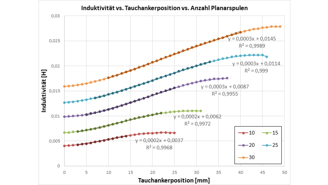 Das elektrische Verhalten der neuartigen Spule wurde im Versuchsaufbau in Bild 7 getestet, bei dem ein Eisenstab (Target) mithilfe eines positionierbaren Schlittens stirnseitig in die Spule eindringt. Die Induktivität wird mittels LCR-Meters bei einer Frequenz von 10 kHz ermittelt (Bild 8). Die Induktivität steigt über die Eindringtiefe des Targets und erfährt eine Sättigung, wenn das Target den Spuleninnenraum vollständig füllt. Innerhalb eines bestimmten Wegbereichs verändert sich die Induktivität quasilinear über die Targetposition. Wird die Anzahl der kombinierten Planarspulen erhöht, vergrößert sich der lineare Messbereich und es erhöht sich die Gesamtinduktivität.