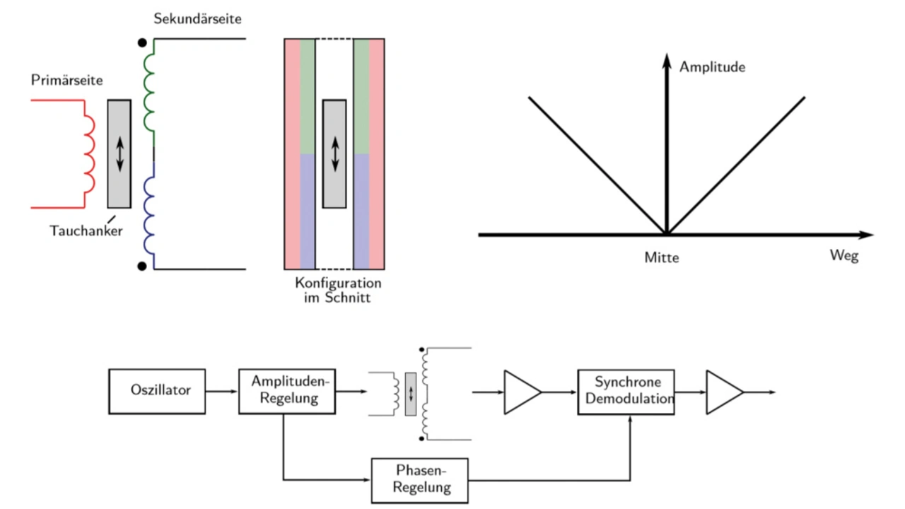 Die Amplitude dieses Signals verändert sich über die Position des Targetringes und erfährt sein Minimum, wenn sich der Targetring in Gesamtspulenmittenposition befindet. Ausgehend von dieser Mittenposition verhält sich die Amplitude der in Serie verschalteten Sekundärspule linear über die Position des Targetringes. Mit Hilfe einer speziellen Auswerteschaltung unter Verwendung eines synchronen Demodulators kann aus diesem Amplitudenverhalten ein über den Gesamtweg des Targetringes lineares Ausgangssignal generiert werden.