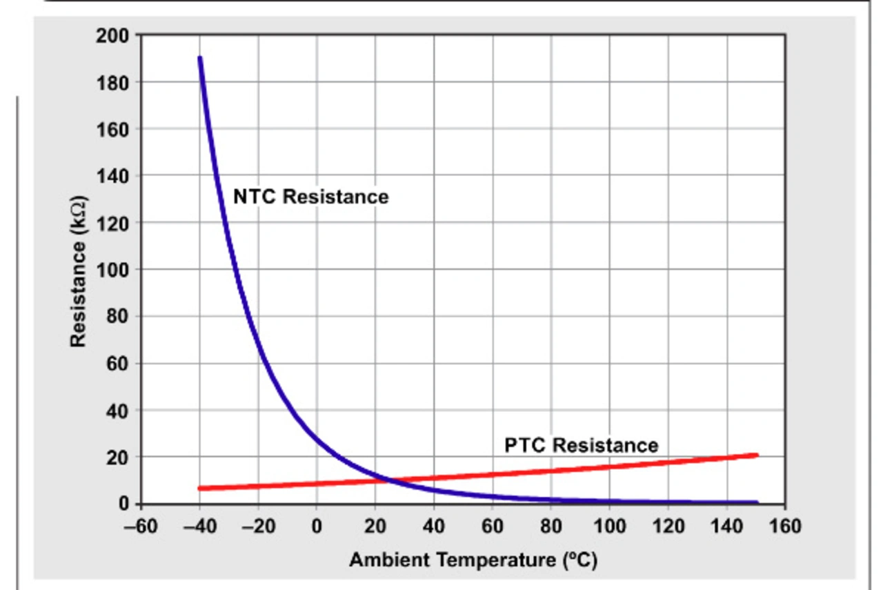 Bild 1 zeigt einen sehr hohen Widerstand des NTC-Thermistors bei niedrigen Temperaturen, der sich mit steigender Temperatur immer weiter verringert. Der Verlauf zeigt auch, dass die Widerstands-Temperatur-Kennlinie bei höheren Temperaturen immer flacher wird. Für einen PTC-Thermistor bedeutet das, dass auch die Empfindlichkeit bei höheren Temperaturen stark abfällt. Im Unterschied dazu zeigt der siliziumbasierte PTC-Thermistor in ein weitgehend lineares Verhalten und gleichbleibender Empfindlichkeit über den Temperaturbereich. In einigen Anwendungen betrachtet man dies als einen Vorteil der PTC-Thermistoren.