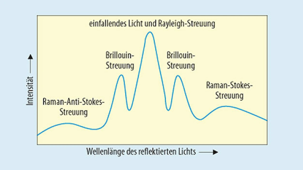 Wegen dieser Einschränkungen hat die Forschung nach alternativen Verfahren gesucht, die erstens die gesamte Faser kontinuierlich auf ihrer ganzen Länge nutzen können und zweitens keine besondere Vorbehandlung erfordern. Die Grundlage: In eine Glasfaser eingestrahltes Licht wird immer zu einem sehr geringen, aber messbaren Anteil zurückgestreut und kann am Ort des Senders detektiert werden. Hier treten drei verschiedene physikalische Effekte auf, die nicht miteinander verwechselt werden dürfen: Rayleigh-Streuung, Brillouin-Streuung und Raman-Streuung (Bild 1). Alle sind technisch nutzbar; welche man auswählt, hängt von den Erfordernissen des jeweiligen Einzelfalls ab.