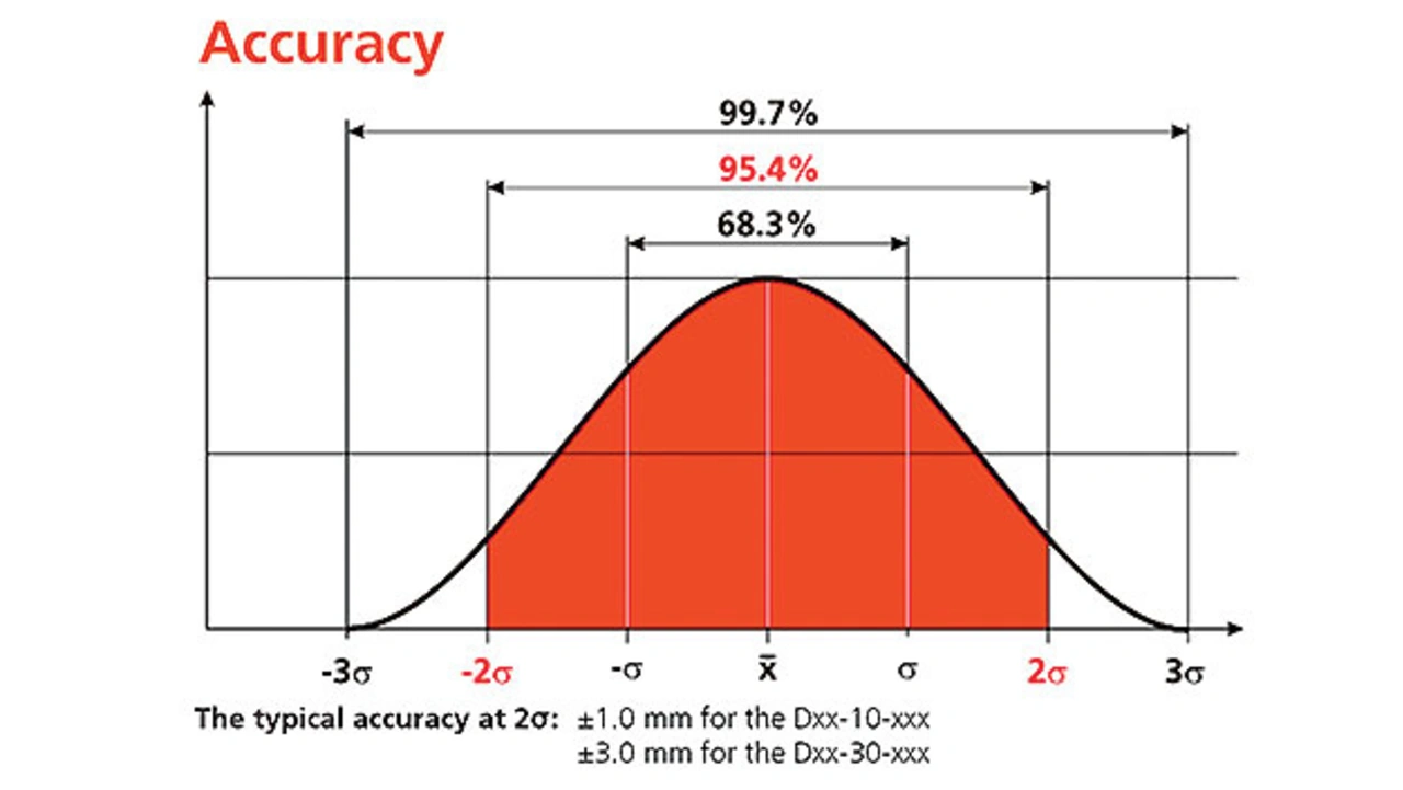 Ihre Messgenauigkeit wird mit einer statistischen Sicherheit von 95,4 % spezifiziert (entsprechend ISO 1938-2015). Das ist gleichbedeutend mit ±2σ also zweimal die Standardabweichung (Bild 3). Distanzfehler durch Temperatureinflüsse und Linearitätsfehler sind hierbei bereits berücksichtigt. Die Messgeschwindigkeit reicht bis 250 Hz bei einer Ausgaberate von 1 kHz. All diese Eigenschaften können Anwender auch im erweiterten Temperaturbereich von -40 bis +60 °C nutzen.