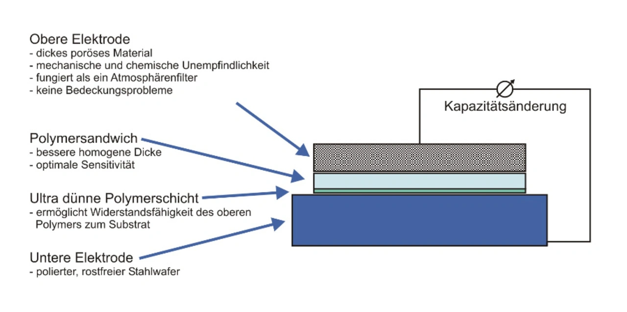 Damit die Feuchte von außen in das Polymermaterial diffundieren kann, besteht die Oberseite der Kondensatorplatte aus porösem Metall. Gleichzeitig fungiert die Oberseite als Schutz vor Verunreinigungen. Die untere Elektrode ist aus rostfreiem Stahl. Zwischen diesen beiden Elektroden befindet sich das feuchtigkeitssensitive Polymer. Das Polymer reagiert reproduzierbar auf Feuchteabsorption und -desorption und bewirkt eine Kapazitätsänderung des Kondensators.