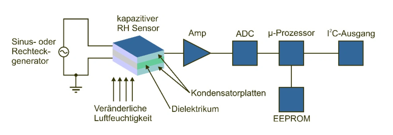 Die Permittiviät ε = ε0·εr gibt die Durchlässigkeit eines Materials für elektrische Felder an. Die relative Permittivität εr eines Stoffes, der sich zwischen zwei leitenden Kondensatorplatten befindet, sagt aus, um das Wievielfache sich die Kapazität gegenüber einem Kondensator im Vakuum oder an Luft erhöht. Die Permittivität ist keine Konstante. Sie ist frequenz- und feuchtigkeitsabhängig. Wird ein hygroskopisches Isoliermaterial, z. B. ein Polymer zwischen die beiden Platten des Kondensators eingebracht (Bild 1), ändert sich εr in Abhängigkeit von der Feuchtigkeit. Die resultierende Änderung der Kapazität wird ausgewertet.