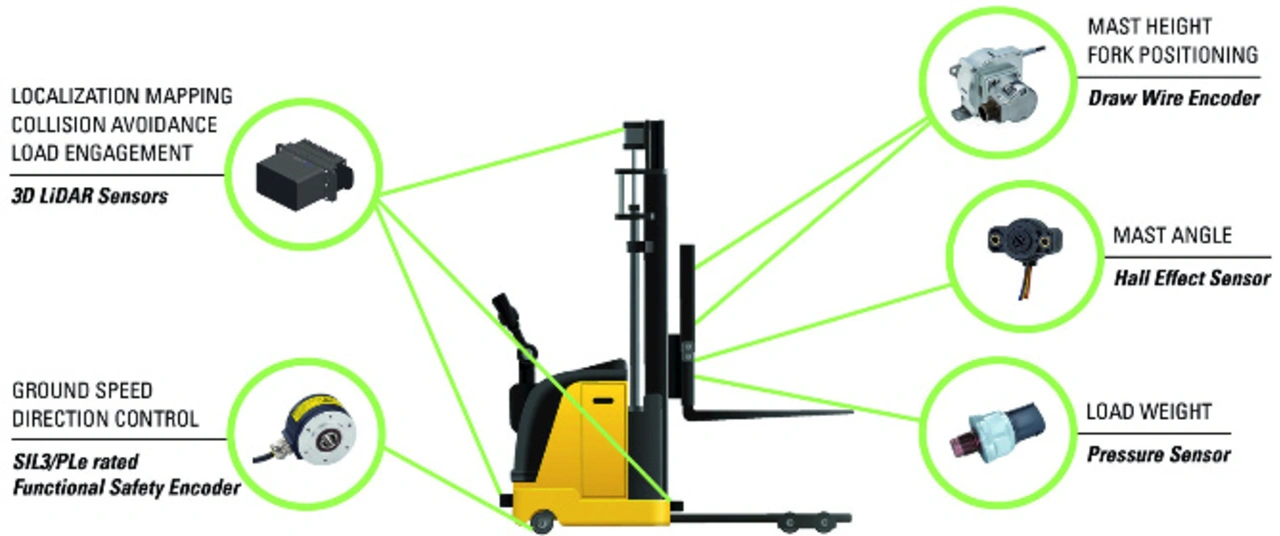 Diese Anwendungen erfordern zusätzliche Geber und Positionssensoren, um einen sicheren und kontrollierten Betrieb sicherzustellen. Die Masthöhensteuerung mag für herkömmliche Gabelstapler als verzichtbar angesehen werden, ist jedoch für fahrerlose Flurförderfahrzeuge unerlässlich.