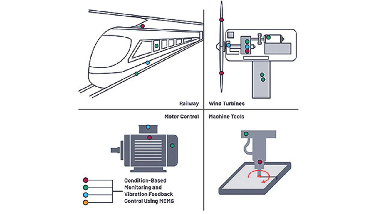 MEMS-Sensoren (Mikro-Elektromechanische Systeme) werden zur Schwingungsüberwachung in Eisenbahnen, Windkraftanlagen, Motorsteuerungen und Werkzeugmaschinen eingesetzt (Bild 1). Sie sollen die Betriebssicherheit erhöhen, Kosten senken und die nutzbare Lebensdauer der Systeme maximieren. Wie frühzeitig drohende Lagerschäden erkannt werden, hängt von der Leistungsfähigkeit der MEMS-Sensoren ab. Zur Schwingungsüberwachung sind Modelle mit hoher Bandbreite (0 bis 23 kHz), geringem Rauschen und einem weiten Messbereich (2 g bis 200 g) nötig. In der Regel werden dafür drahtgebundene Sensoren genutzt. Die Rohdaten der Sensoren erfasst entweder ein Kommunikationssystem und sammelt sie – oder sie werden in eine Steuerung eingespeist.