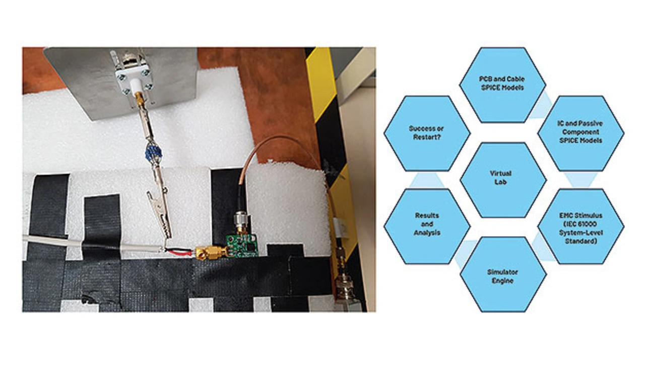 Das virtuelle EMV-Labor besteht aus SPICE-Modellen, Simulatoren für elektromagnetische Felder und CAD-Software. Es ermöglicht dem Entwickler eine hohe Testgenauigkeit und hohe Simulationsgeschwindigkeiten. Leiterplatten, Kabel, integrierte Schaltungen, passive Komponenten und EMV- Stimuli lassen sich virtuell nachbauen.