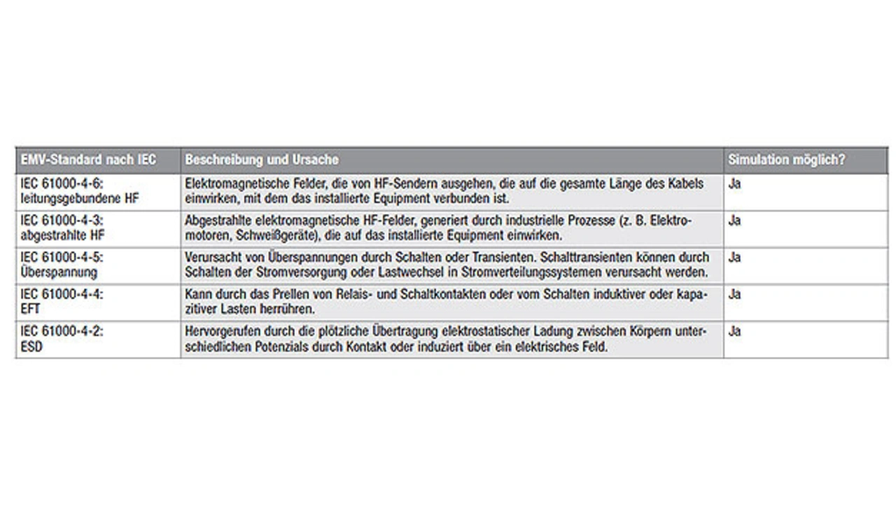 Die Simulation erfolgt in mehreren Schritten, die rechts in Bild 3 gezeigt sind. Mit der Software lassen sich mehrere industrielle EMV-Standardtestverfahren auf Systemebene bereits vor der Fertigung der Leiterplatte simulieren. Vor allem aus der IEC 6100 werden zahlreiche Testverfahren unterstützt (Tabelle 1).