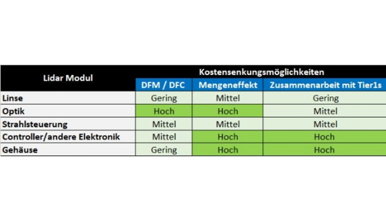 Wir können an die Frage der Kostenskalierung auch auf Modulebene herangehen, indem wir die Hauptmodule eines Lidars prüfen und feststellen, welchen Spielraum sie für eine signifikante Kostensenkung in den drei oben genannten Kategorien bieten. Die folgende Tabelle bietet einen groben Anhaltspunkt mit einer allgemeinen Bewertung unter Berücksichtigung der gängigen Lidar-Technologien.
