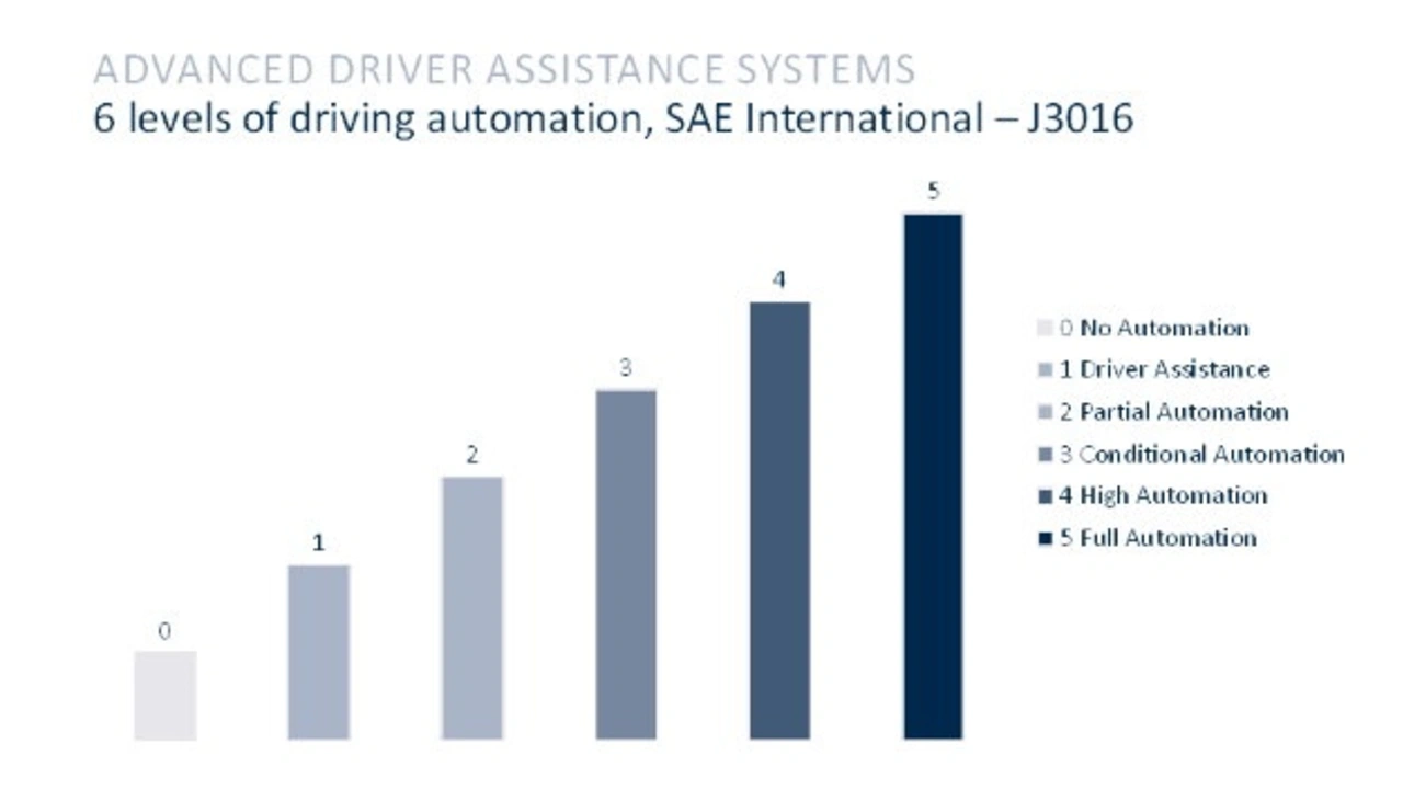 Im Standard SAE J3016 sprechen Experten von sechs Stufen der Fahrautomation. Stufe 0 bedeutet keine Automation, die Stufe 1 sind Assistenzsysteme, Stufe 2 Teilautomation („Feet off“) und Stufe 3 bedeutet eine bedingte Automatisierung. Mit Stufe 3 ist autonomes Fahren gemeint, bei dem der Fahrer auf die Anforderung zum Eingreifen reagieren muss („Hands off“). Der Übergang von Stufe 2 und Stufe 3 ist aktuell der Bereich, in dem sich die technologisch führenden Hersteller in ersten Serienmodellen bewegen. Die nächste Stufe 4 ist autonomes Fahren, das auch dann fortgeführt wird, wenn der Fahrer nicht reagiert („Brain off“) Stufe 5 ist die Vollautomatisierung und bedeutet dann, dass die dynamische Fahraufgabe unter allen Umgebungsbedingungen vom System ausgeführt wird („Driver off“). Doch bis dahin ist es noch ein weiter Weg.