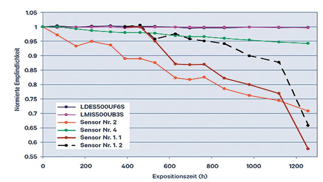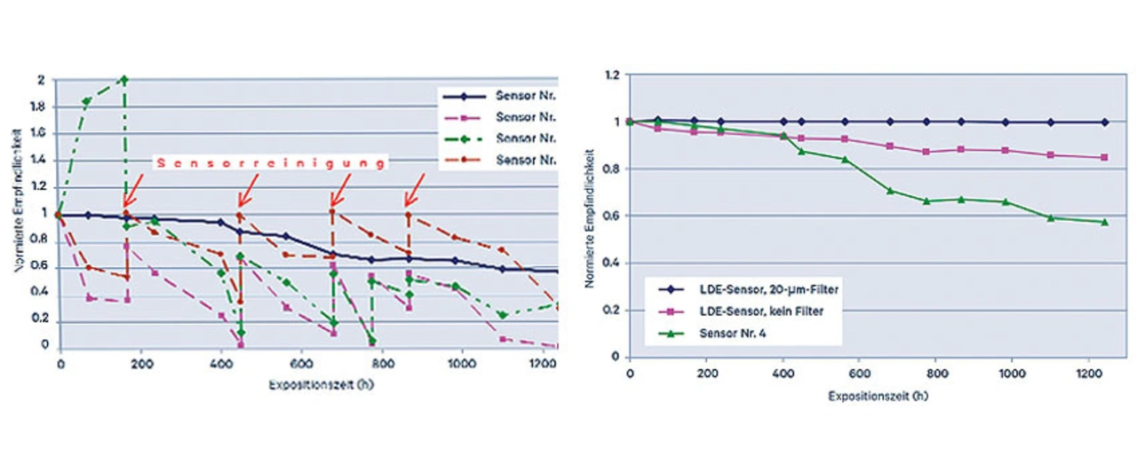 Ohne Filter kam es zu einer leichten Absenkung des Wertes. Bei den konventionellen Sensorversionen waren dagegen starke Schwankungen der Genauigkeit zu verzeichnen (Bild 4, links). Die Sägezahnkurve in der Sensorempfindlichkeit in Bild 4, links entsteht, weil die Sensoren 1 bis 3 während des Tests regelmäßig pneumatisch gereinigt wurden. Für Sensor 3 ist vor der ersten pneumatischen Reinigung eine Abnormalität zu beobachten. Normalerweise führt eine Verstopfung des Strömungskanals zu einer Verringerung der Empfindlichkeit. Bei diesem spezifischen Sensor wurde während der Expositionszeit bis ca. 200 h das gegenteilige Ergebnis beobachtet. Eine mögliche Erklärung ist der sehr breite Kanal des Sensors. Staubpartikel, die durch den Kanal wandern, können direkt am Sensorelement haften bleiben und eine lokale Störung des Strömungsprofils verursachen. Wahrscheinlich hat in diesem speziellen Fall eine solche Störung eine Erhöhung des Sensorsignals verursacht. Nach der Reinigung verhält sich der Sensor wieder normal.