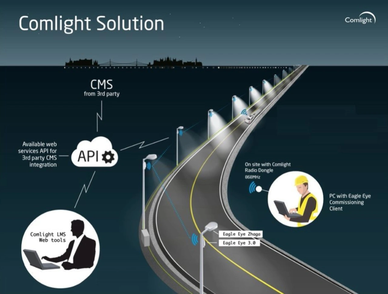 Um die Installation der Straßenbeleuchtung zu vereinfachen, sind die Sensoren von ComLight mit einem Zhaga-Anschluss ausgestattet. Die Schnittstellenspezifikation ermöglicht es unter anderem, die Sensoren innerhalb von Minuten zu installieren oder bei Bedarf auch schnell auszutauschen. Falls gewünscht, lassen sich die Leuchten vernetzen und ans Internet anbinden, um beispielsweise den Energieverbrauch, Leuchtdauern, die Nutzungsfrequenz und andere Daten zu erfassen und auszuwerten.