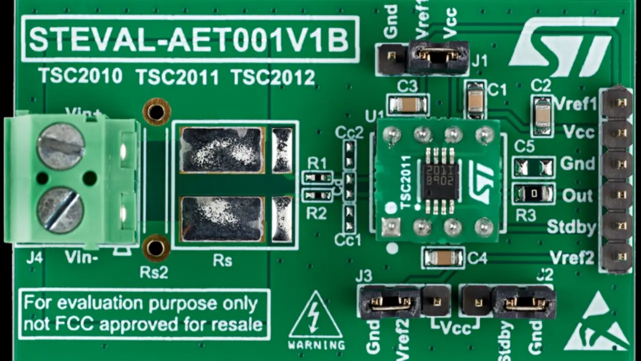 Entwicklern steht das Evaluierungsboard STEVAL-AETKT1V2 für einen schnellen Einstieg in die Verwendungsweise des TSC2011IST zur Verfügung (Bild 6). Er kann Strom über einen weiten Bereich von Gleichtaktspannungen von -20 bis +70 Volt messen. Der TSC2011IST verfügt über folgende Merkmale: