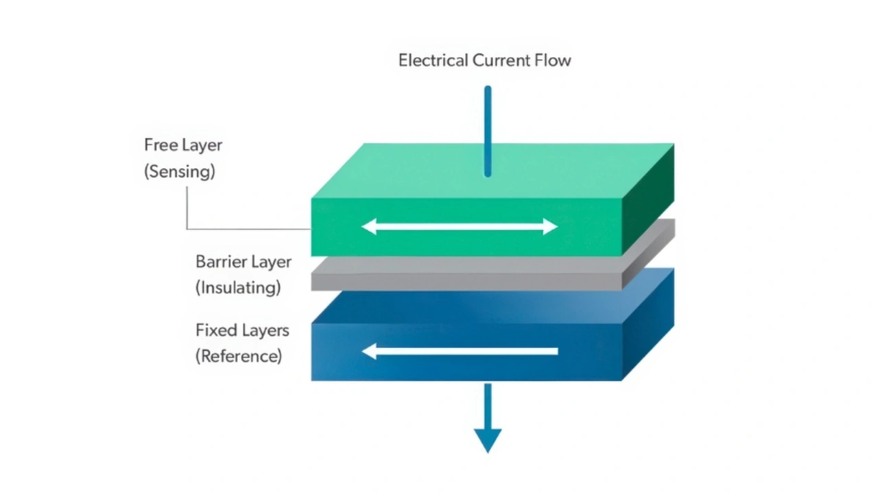 TMR-Sensoren nutzen einen quantenmechanischen Effekt, der eine besonders vorteilhafte Kombination aus hoher Geschwindigkeit und niedrigem Rauschen ermöglicht. Das Sensorelement besteht aus einer geschichteten magnetischen Struktur, bei der zwei Schichten durch eine ultradünne isolierende Barriere voneinander getrennt sind. Wenn ein externes Magnetfeld die magnetischen Schichten ausrichtet, können Elektronen diese Barriere durch quantenmechanisches Tunneln überwinden, was zu einem starken Abfall des elektrischen Widerstands führt.