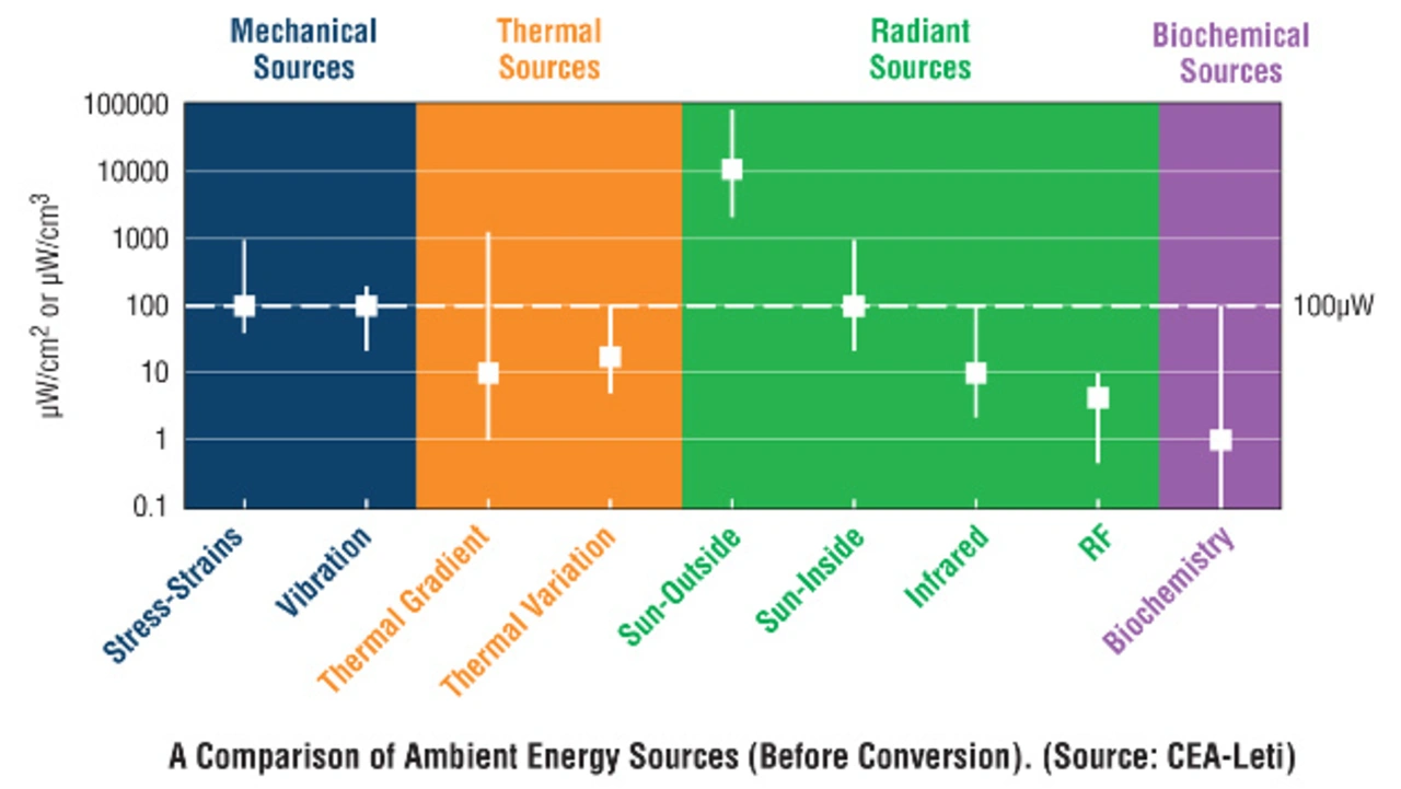 Bild 1 zeigt die Energiedichte aus diesen Quellen in Form von µW/cm2 oder µW/cm3, je nach zwei- oder dreidimensionalem Kollektor. Demnach ist Tageslicht im Freien am ertragreichsten, dicht gefolgt von Wärme, Dehnung und Innenbeleuchtung.