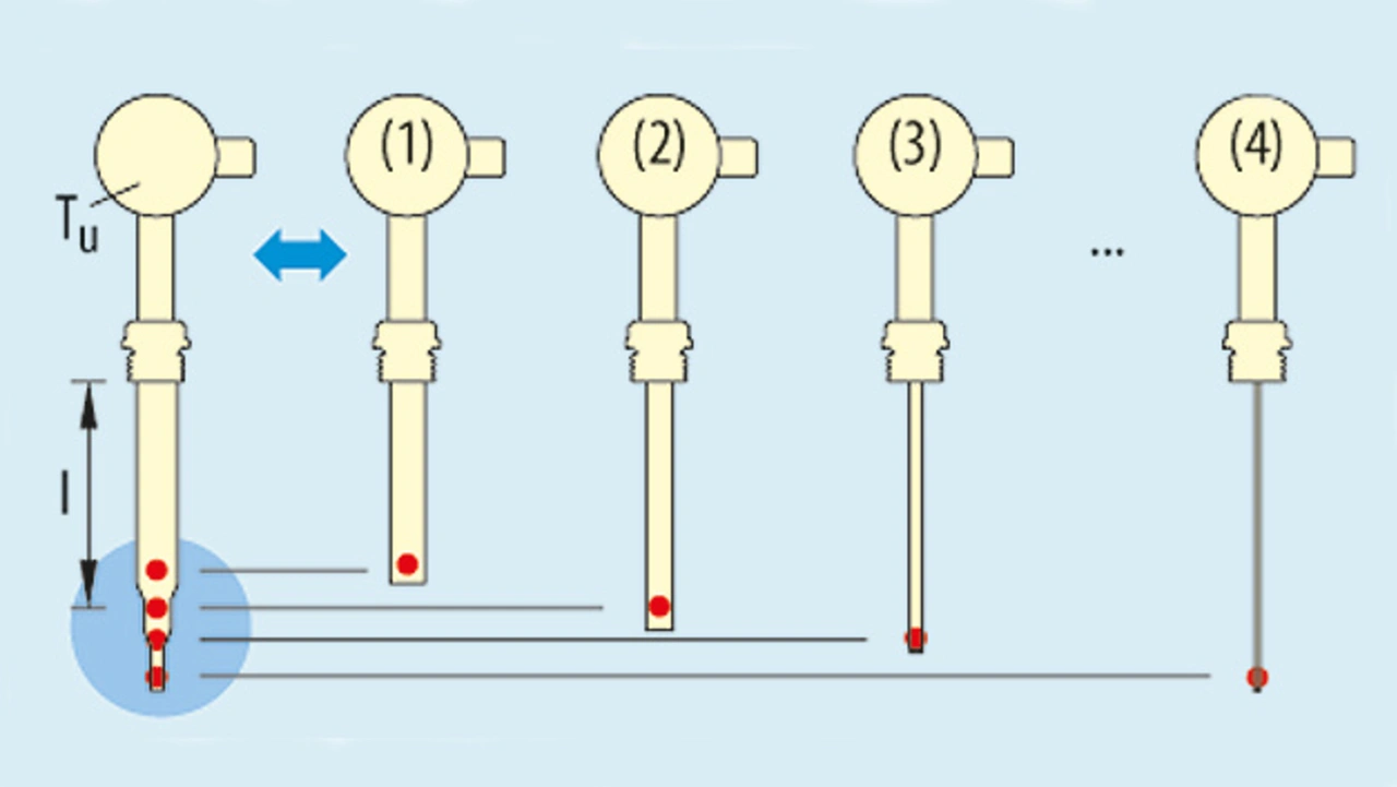 Im nachfolgenden Beispiel wurde ein derartiges Messsystem mit einer Doppelrohrvariante, einem stark gestuften Schutzrohr sowie einem integrierten Auswertesystem im Sensorkopf (Bild 5) aufgebaut. Mit der gewählten Doppelrohrvariante wird die sogenannte Prozessprüfbarkeit erreicht. Das heißt, während im vorderen kleinen Schutzrohr die Sensoren angeordnet sind, bleibt das andere Schutzrohr leer und kann in bestimmten turnusmäßigen Abständen mit einem dünnen Normalthermometer bestückt werden, um insbesondere Driftabweichungen feststellen zu können.