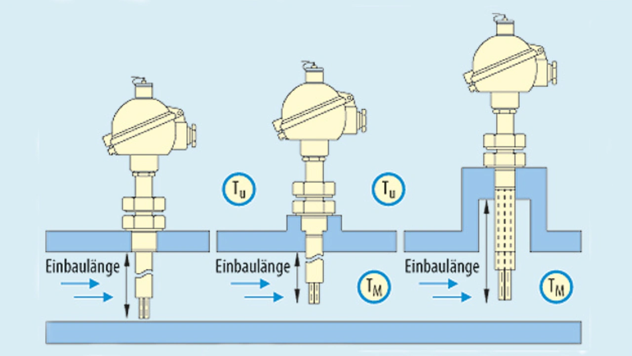 Die integrierten Pt100 sind direkt auf die Auswerteelektronik geführt, die wiederum über einen Sensorstecker M12x1 nach außen geführt ist. Bei einer weiteren Ausführungsvariante wurde zur Erhöhung der funktionalen Sicherheit parallel in einem weiteren Schutzrohr der gleiche Aufbau nochmals dargestellt, hier aber analog über einen zweiten Stecker nach außen geführt. Somit ist es zusätzlich möglich, die Ergebnisse der Auswertung mittels der integrierten Elektronik noch einmal konventionell zu vergleichen. Die hierzu durchgeführten Untersuchungen betrafen verschiedene Einbausituationen, wie sie im Bild 6 dargestellt sind.