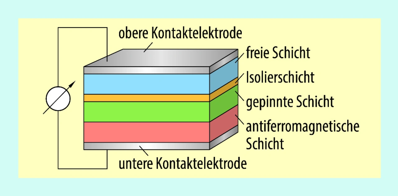 Aufgrund der außerordentlich geringen Schichtdicke, können Elektronen durch die Isolierschicht tunneln und einen Stromfluss durch den Schichtstapel bewirken. Der Widerstand des Gesamtsystems wird durch den Winkel zwischen den Magnetisierungsrichtungen der „freien“ und der »gepinnten« Schicht bestimmt und ist somit abhängig von der Richtung und Stärke des äußeren Magnetfeldes.