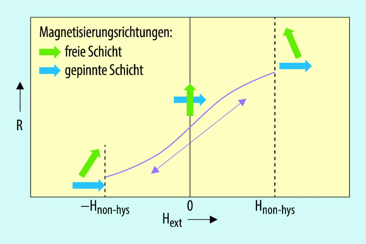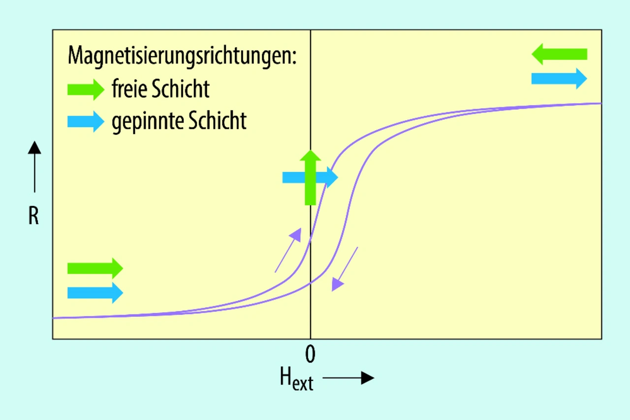 Steigt die Feldstärke des äußeren Felds an, bewirkt dies eine Drehung der Magnetisierungsrichtung in der freien Schicht. Je nach Orientierung des äußeren Felds werden die beiden Magnetisierungsrichtungen, sobald die Sättigung in der freien Schicht erreicht ist, parallel oder antiparallel gerichtet sein. Eine antiparallele Orientierung der Magnetisierung führt zu einem hohen Widerstand, eine parallele Ausrichtung zu einem geringen Gesamtwiderstand des Schichtsystems.