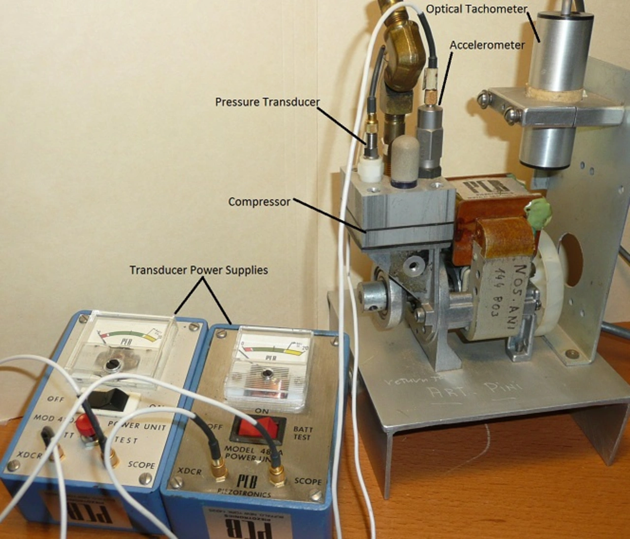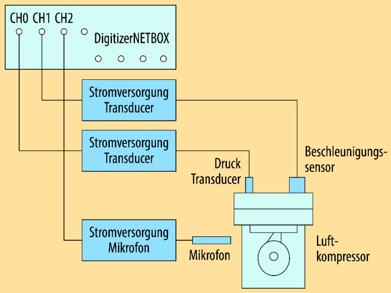 In Bild 4 ist ein Diagramm einer anderen Einrichtung für eine mechanische Messung an einem kleinen Luftkompressor dargestellt. Die Messungen von Druck, Schwingungsbeschleunigung und Schallpegel des internen Zylinders erfolgen mit einem Druckwandler, einem Beschleunigungssensor und einem Mikrofon. Bild 5 zeigt ein Foto des Messaufbaus.