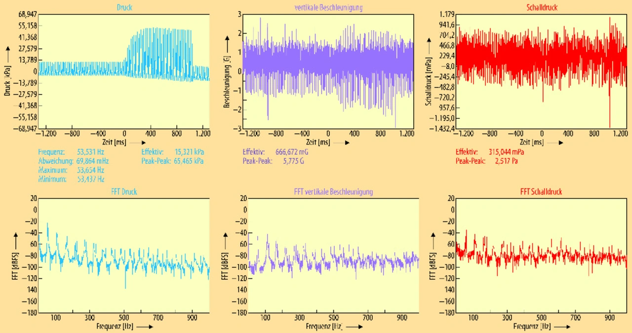 In Bild 6 sind die während einer Kompressormessung angezeigten Daten des Digitizer dargestellt. Die Kurve oben links (Druck) entspricht dem Rohausgang des Druckwandlers. Über die Kanaleinstellungen wird die Wellenform mit einer neuen Skalierung, das heißt von Millivolt (mV) in Pascal (Pa), versehen. Dies erfolgt durch Skalierung der angezeigten Werte des Druckwandlers, die über den Kehrwert seiner Empfindlichkeit ausgegeben werden.