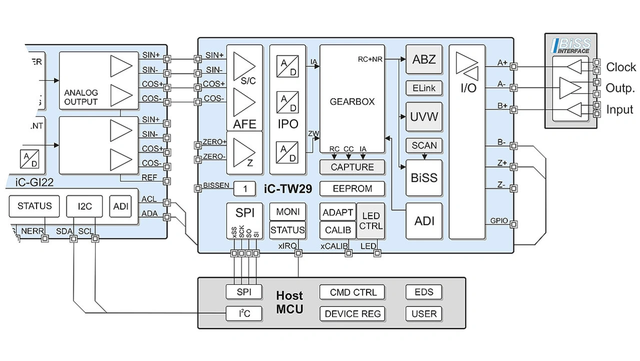 Eine präzise Sin/Cos-Interpolation ist auch für induktiv messende Positionsgeber eine wichtige Kernfunktion. Damit sich ein absolut messendes System über einen Startwinkel initialisieren kann, bietet der Encoder-Prozessor iC-TW29 eine zusätzliche serielle Datenschnittstelle (ADI). Über diese Schnittstelle findet auch der iC-GI22 direkten Anschluss, übergibt seinen Positionswert inklusive Status-Bits beim Aufstart und danach zyklisch zur Systemüberwachung. Die Datensynchronisation erfolgt dabei automatisch.