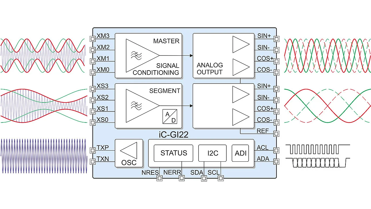 Passend für diese Aufgabe bietet der neue Weg- und Winkelsensor iC-GI22 auf nur 5 mm x 5 mm zwei separate Kanäle zur Signal-Demodulation, zur Aufbereitung und Konditionierung, um eine externe Signalauswertung mit fehlerreduzierten und stabilisierten Eingangssignalen anzusteuern (Bild 2).