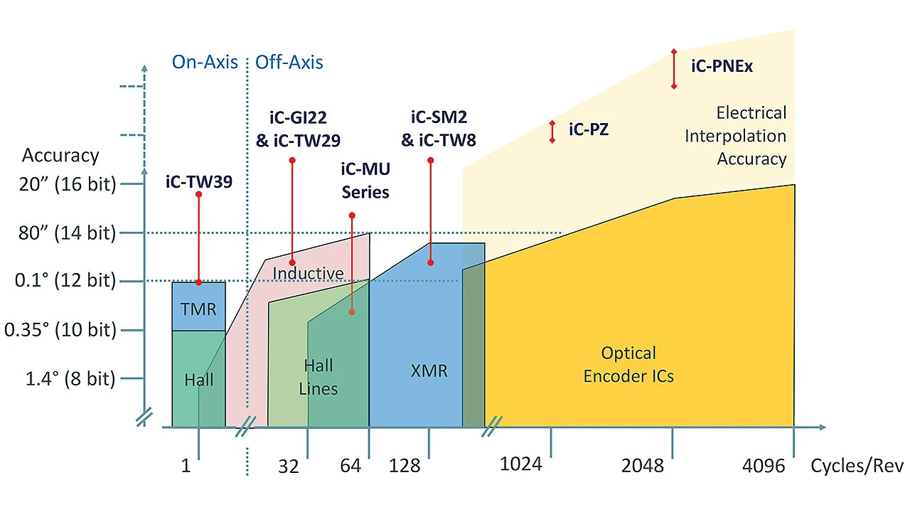 Moderne EncoderBlue-Bausteine – wie der reflexive Absolut-Encoder iC-PZ oder der transmissive Nonius-Encoder iC-PNE – setzen deshalb auf kurzwelliges blaues Licht für eine klare Abbildung und liefern klirrarme Signale für eine weitgehend fehlerfreie Interpolation. Diese Sensoren sind der Benchmark bezüglich Wiederholungsgenauigkeit, und der final erreichbare Winkelfehler wird weniger durch die Elektronik, sondern vielmehr durch die Teilungsgenauigkeit der Maßverkörperung begrenzt (Bild 1).
