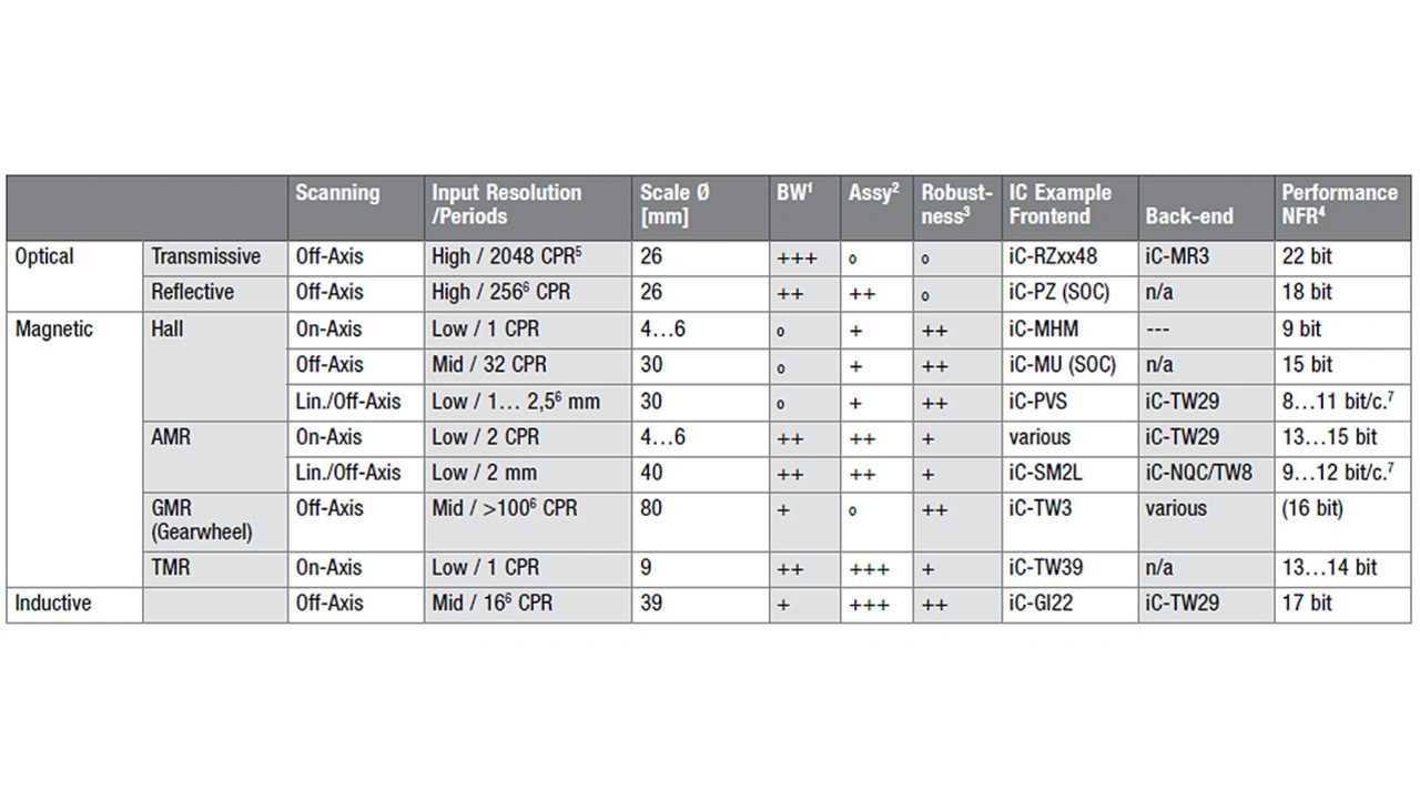 Zudem sind gedruckte Spulen leicht skalierbar, sodass jeder Motor zum Messgerät werden kann, ohne zusätzliche Kugellager oder Kapselung. Tabelle 1 stellt ausgewählte Messsysteme gegenüber und versucht eine Anwendungsbewertung unter Berücksichtigung der angebotenen Sensorsignale, der Montage und der möglichen Winkelgenauigkeit – Eigenschaften, die bei der Komponentenwahl eine Rolle spielen.